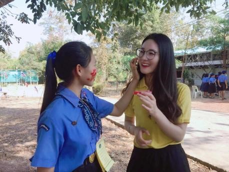 我們的辦公室在學校食堂附近,吃完午飯往往會有一些學生拐到我們辦公室跟我們聊一會兒天再回教室,在食堂吃飯的時候如果撞見學生,他們也會很熱情地喊我坐過去,跟他們一起吃,邊吃邊聊天。下午剛放學的時候大多數學生一般也不會著急走,他們會三五結對,七八成群,在校園中找幾處涼快的地方,席地坐下或躺下,休息片刻。他們還會從學校的樹上打下一些酸角,堆在地上,一堆人圍坐蘸著調料吃。我路過的時候他們也經常喊我加入,跟他們圍坐在一起,互相學習彼此的語言、談論有趣的文化,他們會教我泰國東北部的方言,我每學對一句他們便開始尖叫和狂笑,于是我們便達成了條件,他們每說出5句課上學習過的句子,我便說一句他們的方言。放學時間,校門口往往會有一些小商小販推著小推車賣果汁、燒賣、泰國特色的包子,而我喜歡在校園里溜達,看這些天真爛漫的學生談天說地、唱歌跳舞,完全沒有煩惱,這是他們最好的年紀。