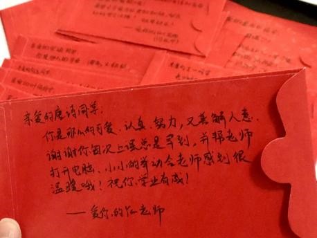 學期結束,臨近春節時我會拿出從國內帶來的紅包和嶄新的人民幣,數額不大但卻是一份心意。很多學生都是第一次見到真實的人民幣,拿到手里的時候都很激動。剛開始上課的時候我開玩笑說這節課表現最好的小組才有的拿,他們兩眼放光、斗志昂揚。下課之后順利獲得了紅包的學生開心無比,惜敗的同學們則顯得有些許沮喪。這時候,我偷偷將剩余的紅包拿出來給了他們一個驚喜,告訴大家所有人都有這個紅包,每一名同學的課堂表現都很棒,每一名認真學習的學生都會擁有這個紅包,全班同學都沸騰了并且深表贊同。我讓他們看看紅包的背面,那里寫了他們的名字,這是個人專屬的,每個名字下面都有一段話,寫著我對他們的期盼和祝福。寄語里有個別詞語我們當時還沒有學習,許久后,有學生給我發消息:“老師,我今天終于完全看懂了你當初給我寫的話,當時我沒有立刻用谷歌翻譯,我告訴自己要留著,等有一天我一定要自己讀懂您給我寫的這些中文?!?/p>