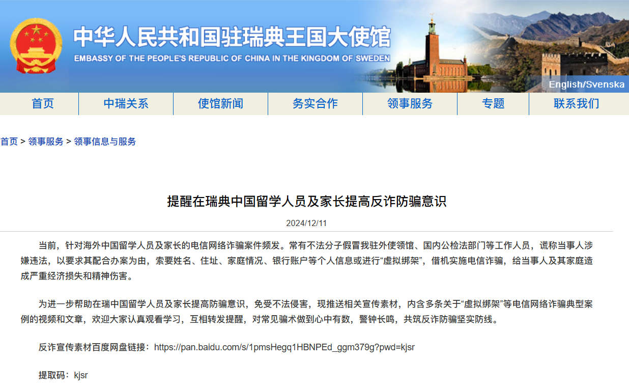 駐瑞典使館:提醒留學人員及家人提高反詐防騙意識