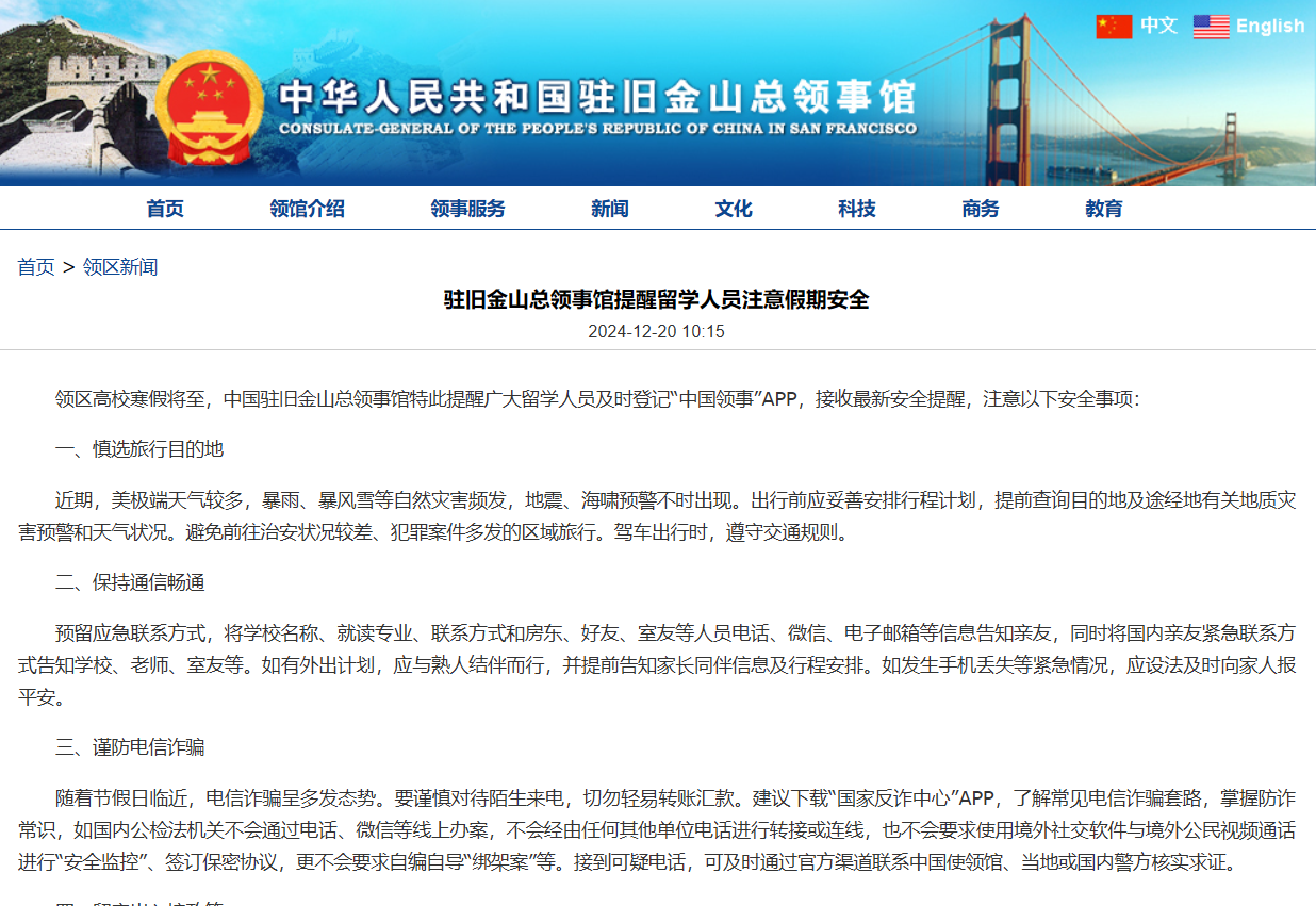 寒假已至,駐舊金山總領館提醒廣大留學人員及時登記“中國領事”APP,接收最新安全提醒。出行前應妥善安排行程計劃,提前查詢目的地及途經地有關地質災害預警和天氣狀況。避免極端天氣和治安較差的區域,駕車出行遵守交通規則。保持通信暢通,預留應急聯系方式,告知親友行程安排。謹防電信詐騙,不輕信陌生來電,切勿輕易轉賬匯款。建議下載“國家反詐中心”APP,了解常見電信詐騙套路,掌握防詐常識。實時關注美國留學、簽證、出入境政策變化,關注學校官網和國際學生辦公室的提醒。
