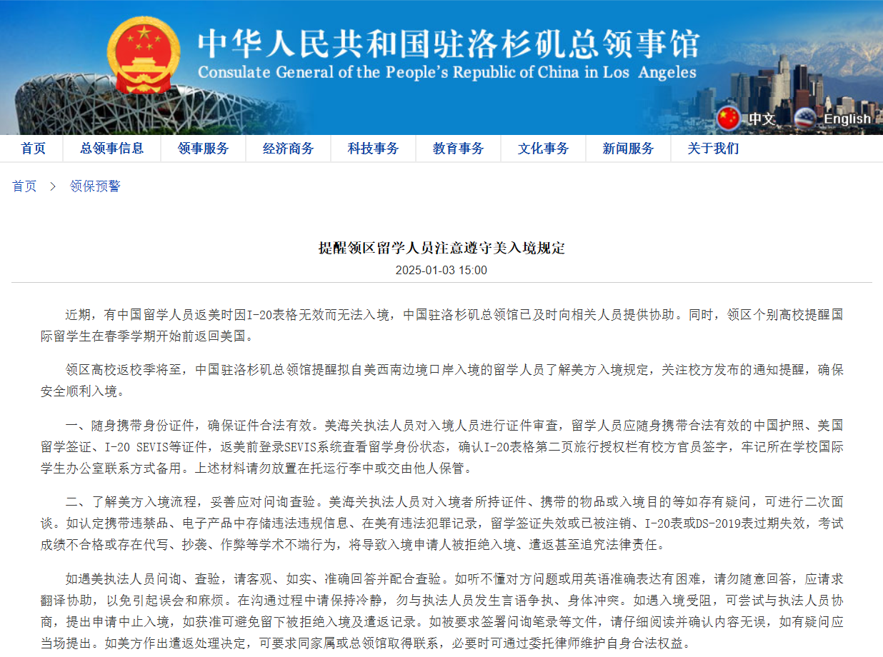 此外,近期有中國留學人員返美時因I-20表格無效無法入境,駐洛杉磯總領館已及時向相關人員提供協助。同時返校季將至,駐洛杉磯總領館提醒擬自美西南邊境口岸入境的留學人員確保攜帶合法有效的中國護照、美國留學簽證、I-20 SEVIS等證件,返美前登錄SEVIS系統查看留學身份狀態,并確認I-20表格旅行授權欄有校方官員簽字。了解美方入境流程,避免攜帶違禁品或存儲違法信息,以防被拒絕入境、遣返或追究法律責任。重要證件勿放托運行李或交他人保管,并牢記學校國際學生辦公室聯系方式。遇美執法人員問詢時,客觀如實回答并配合查驗,如語言困難請求翻譯,避免隨意回答。保持冷靜,避免爭執。入境受阻可協商中止入境,避免遣返記錄。簽署文件前仔細閱讀,有疑問當場提出。如被遣返,可聯系家屬或總領館,必要時委托律師。