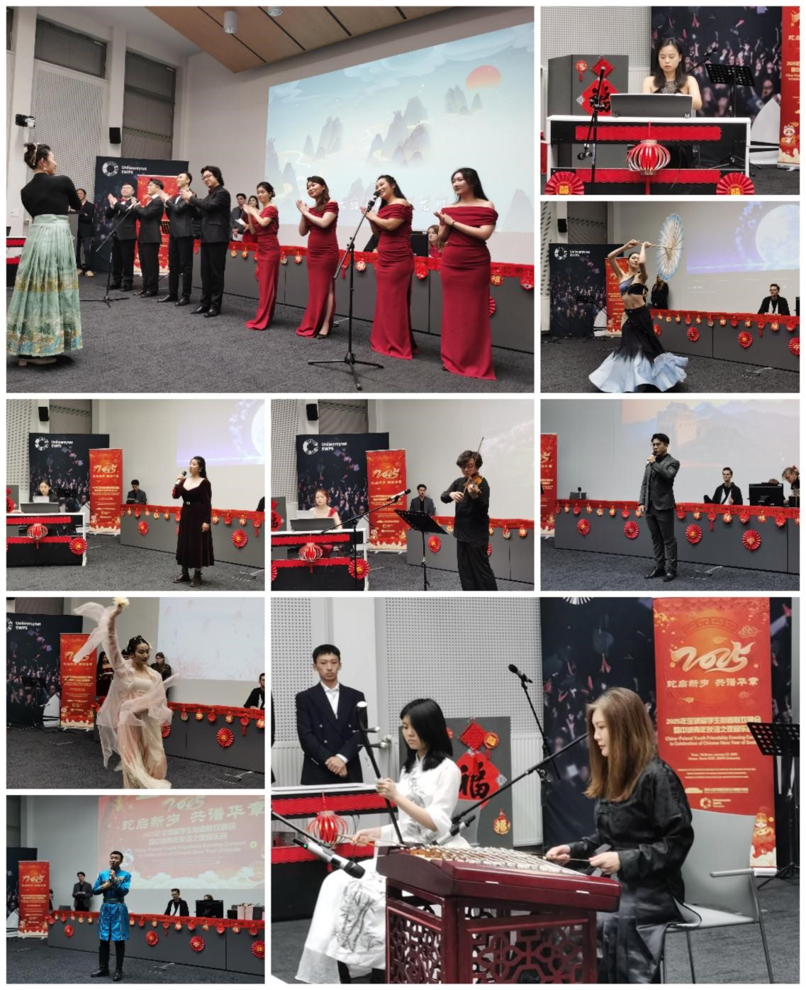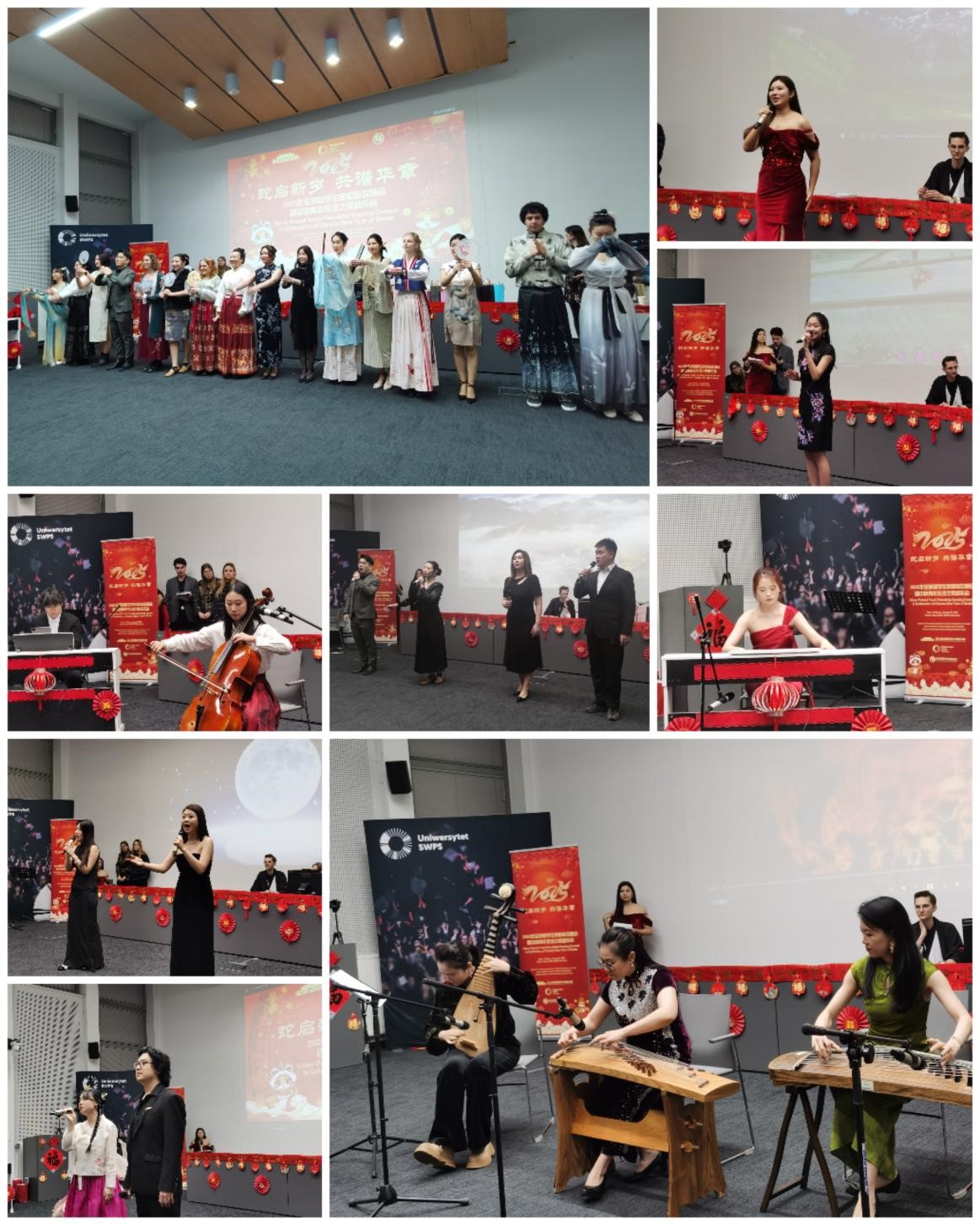 晚會(huì)在大夢(mèng)想民樂(lè)隊(duì)的《喜洋洋》和中國(guó)留學(xué)生芳華合唱團(tuán)的小合唱《上春山》中拉開(kāi)帷幕,鋼琴小提琴協(xié)奏曲《春天》、二重唱《難忘茉莉花》、傣族舞《雨夜》、獨(dú)唱《蘋(píng)果香》表達(dá)留學(xué)人員對(duì)新春的期待和美好祝愿;獨(dú)唱《向往》《美麗中國(guó)》《錦瑟》,古箏琵琶合奏《龍騰》、四重唱《燈火里的中國(guó)》抒發(fā)了海外學(xué)子對(duì)祖國(guó)和親人的熱愛(ài)和思念。歌舞表演《神話》、獨(dú)舞《簪花引》、旗袍漢服秀《蝶錦簪》、鋼琴獨(dú)奏《平湖秋月》《瀏陽(yáng)河》充分展示了中華傳統(tǒng)文化的博大精深和獨(dú)特魅力,晚會(huì)在四重唱《燈火里的中國(guó)》中圓滿落幕。晚會(huì)上,波蘭師生還圍繞中國(guó)年、生肖文化、過(guò)年傳統(tǒng)等進(jìn)行主題演講。
