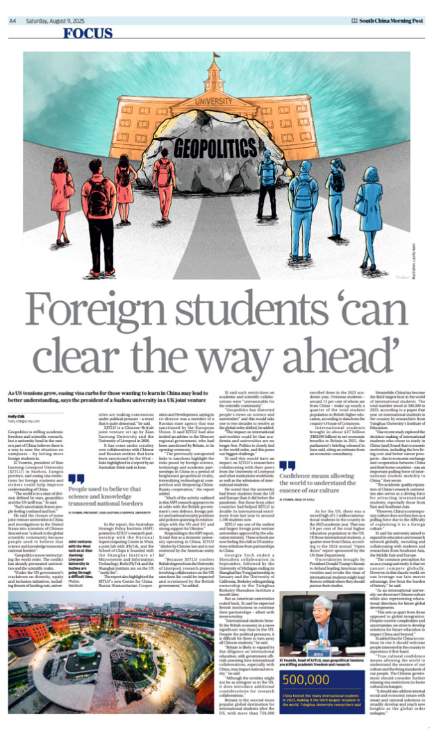 2025 年 8 月 9 日,南華早報刊發采訪西交利物浦大學執行校長席酉民教授的報道