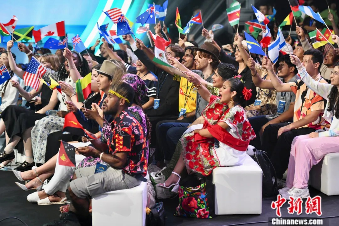 2025年8月24日,第二十四屆“漢語(yǔ)橋”世界大學(xué)生中文比賽全球總決賽在福建平潭舉行。圖為參賽選手為參加最后總決賽的選手加油。中新社記者 王東明 攝