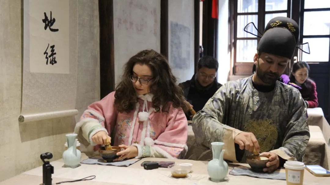 秀野堂內,古色古香,茶香氤氳,幾位同濟大學的外國留學生身著漢服,在老師指導下學習宋式點茶。
