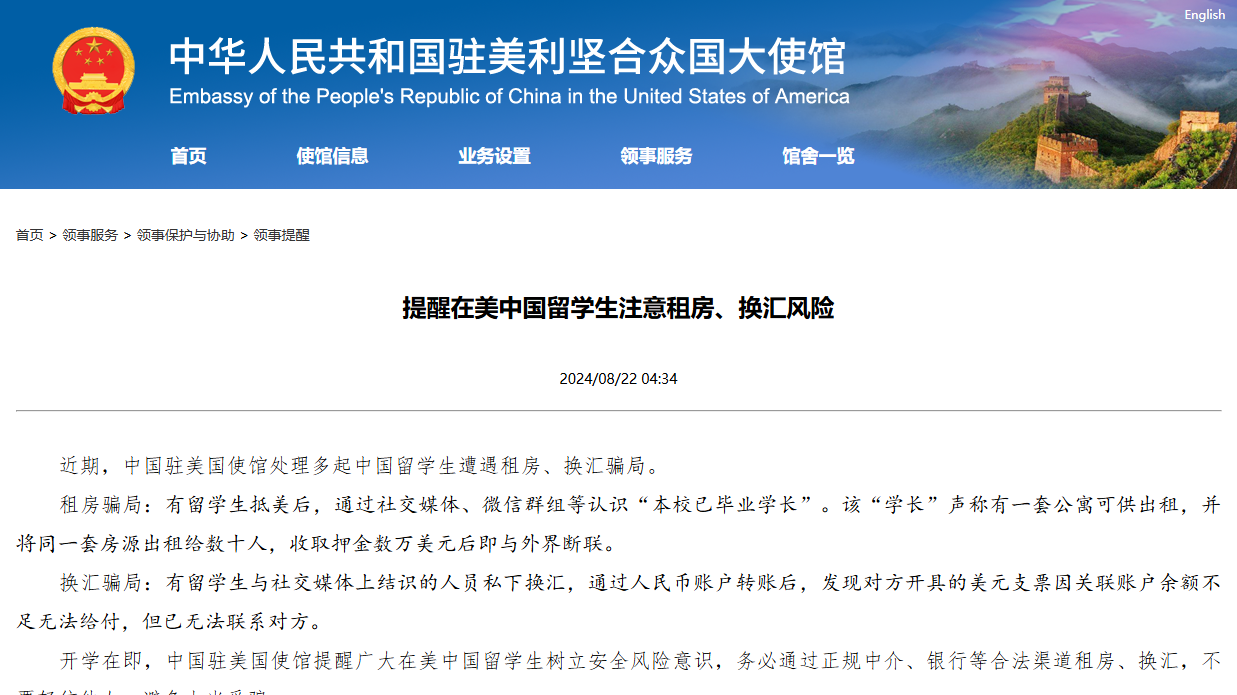 駐美使館提醒在美中國留學生注意租房、換匯風險