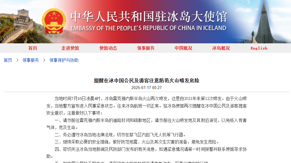 駐冰島使館再次提醒在冰中國公民及游客提高安全意識,請勿前往火山噴發地及其附近游覽,以免吸入有害氣體,危及生命,并做好防范地震、火山及其次...