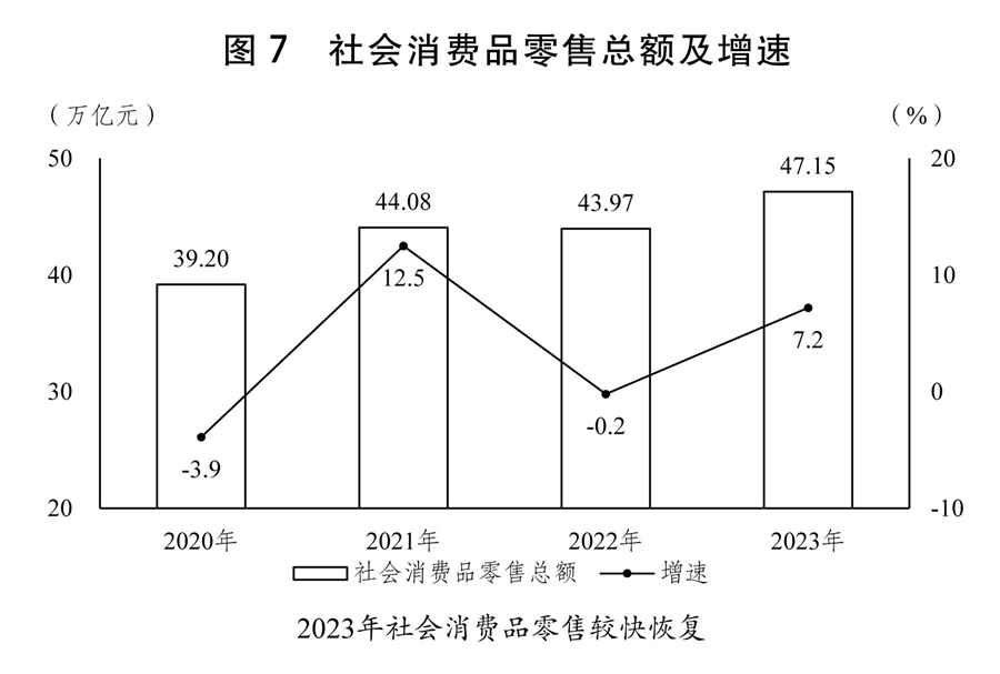 ??一是消費潛力進一步釋放。出臺實施恢復和擴大消費的20條政策措施。穩定和擴大汽車、家居、電子產品等重點消費,延續和優化新能源汽車車輛購置稅減免政策,加快推進充電基礎設施建設,全國充電基礎設施累計達859.6萬臺。加強消費者權益保護,持續優化消費環境。推動文化、旅游、餐飲等生活服務消費加快恢復,全年服務零售額增長20.0%,國內出游人次、居民出游花費分別增長93.3%和140.3%。全年社會消費品零售總額達到47.15萬億元,增長7.2%,其中,網上零售額達到15.43萬億元,增長11.0%。成功舉辦中國品牌日活動。開展“消費提振年”活動。加快國際消費中心城市培育建設。