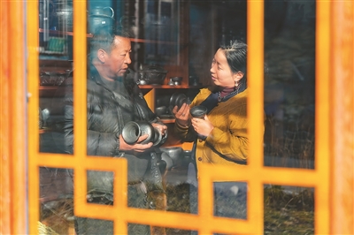 在德格縣麥宿鎮的扎堪倉黑陶工坊,達瓦卓瑪(右)向工坊主理人降擁格乃了解工坊近期的經營情況以及新品研制進展。新華社記者 沈伯韓攝