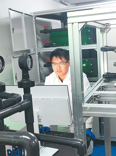 周明月正在進行液流電池充放電測試。