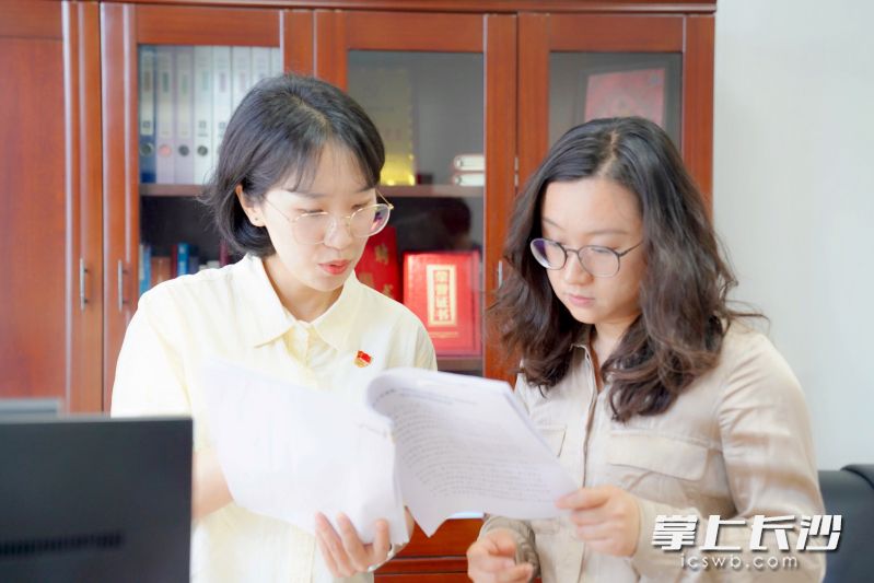 熊欣葉(左)和同事討論法律法規熱點。長沙晚報全媒體記者 張禹 通訊員 段華良 攝影報道