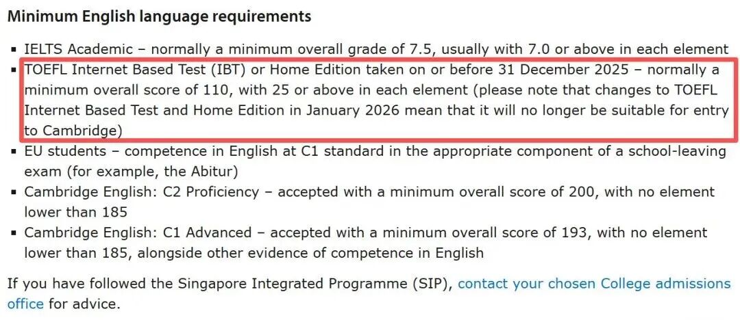 劍橋同樣如此:2025年12月31日前考的托福(需滿足總分110+、單項25)才有用,2026年1月及之后的成績,直接無法用于劍橋本科申請。