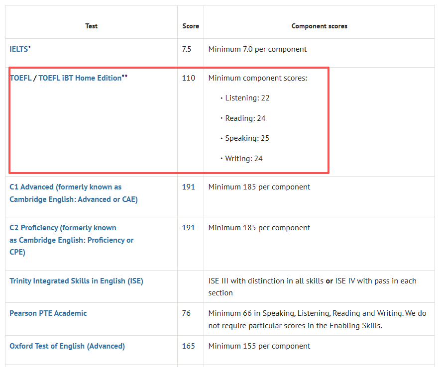 托福網(wǎng)考(含家庭版和紙筆版)都接受,須單次考試達標(biāo);成績有效期為課程開始(9月1日)前2年。