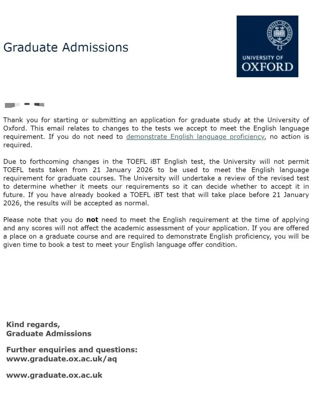 目前,牛津已通過官方郵件與官網(wǎng)入學(xué)語言要求雙通道宣布:2026年1月 21日起,新版TOEFL iBT成績將不再被認可為研究生課程的語言能力證明材料。