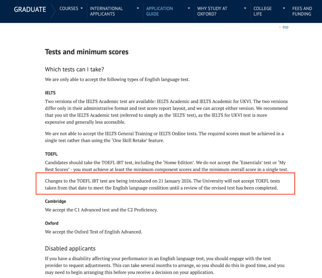 牛津研究生申請者:務(wù)必記好2026年1月21日這個節(jié)點——之后考的新版TOEFL iBT成績將不被認可,但1月21日前考出的成績,仍能正常提交用于申請。
