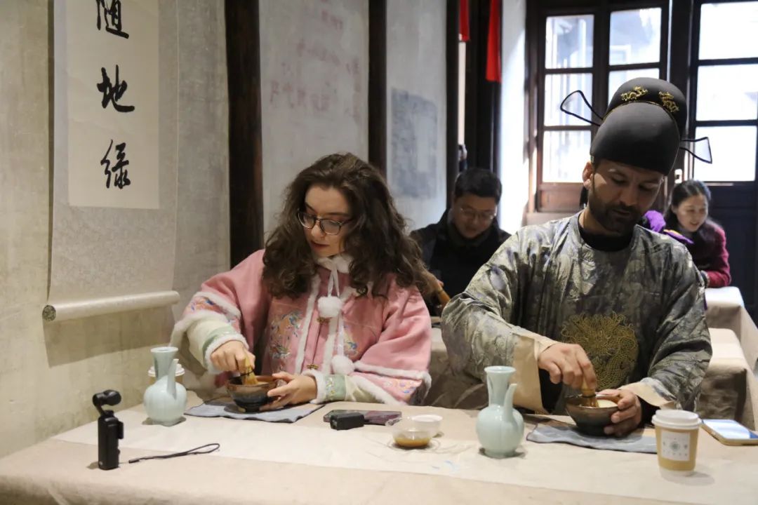 “原來喝茶有這么多工序,很有意思。”來自土耳其的司娜,一邊體驗著點茶的每一個細(xì)節(jié),一邊用云臺相機記錄下全過程:“我打算把視頻上傳到我的社交媒體賬號上,讓我家鄉(xiāng)的人了解中國茶文化,感受中國年味。”氛圍感十足的點茶現(xiàn)場,也讓大家對宋朝人們的風(fēng)雅生活有了沉浸式的感受。來自巴基斯坦的Wali對活動環(huán)境充滿好奇:“這樣的房子太有風(fēng)格了,非常特別,這個活動也很棒。”