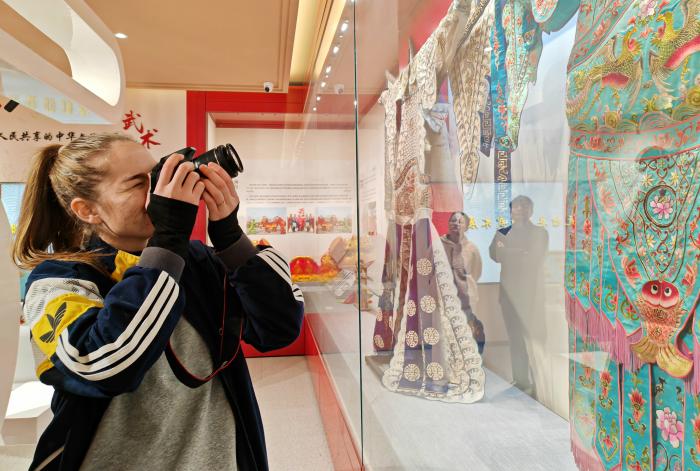 11月2日,法國留學生在無棣古城非遺館拍攝民族服飾。